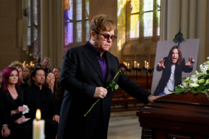 Elton’s Emotional Ode With the hush descended and half the world on silent tribute, Elton rode the notes of Goodbye Yellow Brick Road—a song never more fitting, perhaps, for one of rock’s darkest princes. As he sang, his trademark glasses glinted with tears; the congregation included Sharon Osbourne, daughters Kelly and Jack, and a cadre of music royalty—from Joan Jett to Slash. A Scene of Rock Royalty