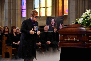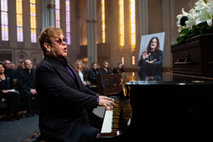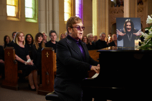 Halfway through, something extraordinary happened: Sharon Osbourne, dressed in mourning black, surprised attendees by joining Elton. Her clear, heartfelt tones soared with his in the chorus—a duet never formally recorded, but undeniably powerful. Witnesses said their voices “intertwined like two river streams merging into one.” A Tribute Fit for Metal’s Royalty